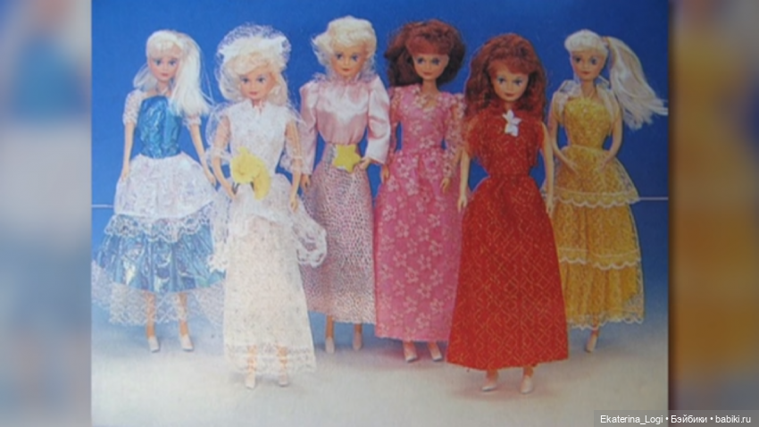 У меня было две. Одна в красном платье с телом-дутиком и белыми туфлями, рыженькая, она на фото, в узкой коробке без фото на коробке, по-моему; другая, блондинка в розовом платье из синтетического розового атласа, розовыми туфлями, аксессуарами в виде большого розового флакона, сумочкой (кажется, всё), у этой гнулись ручки и сгибались ножки. Сзади на коробочке была фотография с несколькими куклами в платьях разных цветов. Сама коробка белая. Цвет первой не помню, но, не белый по-моему.