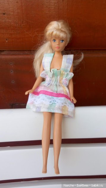 Здравствуйте, жители нашей любимой Кукляндии! А у меня неожиданная встреча: смотрите-ка, кто ко мне пожаловал: сама Петра! Я никогда не интересовалась куклами семейства Барби, их не было в моём детстве. А эту девочку я приметила, приютила у себя. Интересная фигура, с наклоном, я таких не видела пока. И наряд а-ля 90 годы, эти ультра-цвета, эти пышные ярусные юбочки. У куколки есть дефект: отваливается левая ножка, там в бедре наполовину сломано крепление. А так ноги гнутся, как у Барби.