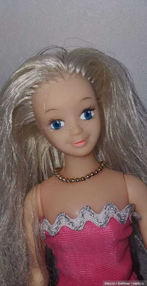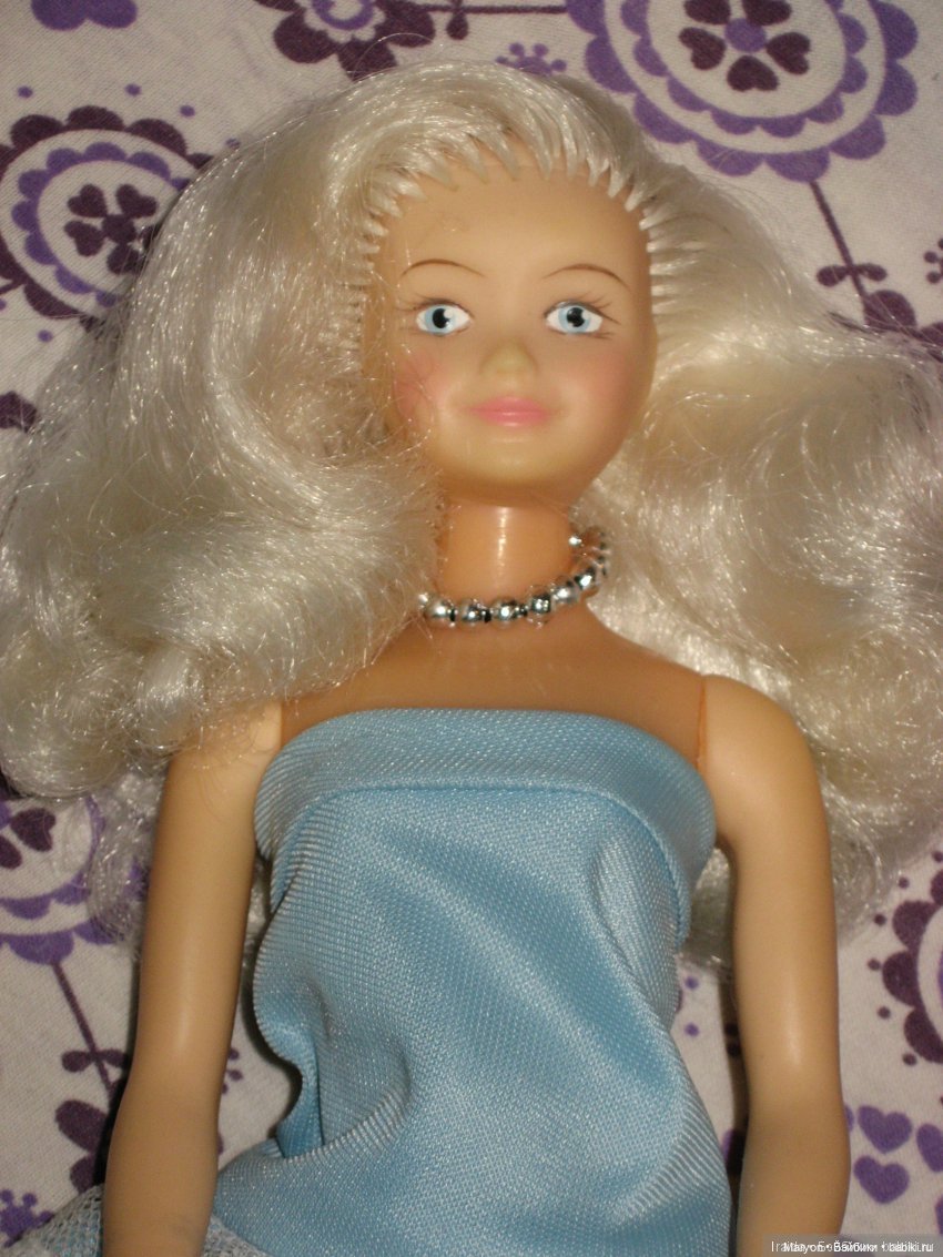 Рост куклы примерно как у Барби начала 90-х, а вот комплекция покрупнее, шире талия и бедра. Туловище выполнено из твердого и прочного пластика, похожего на пластик наших советских кукол; руки, ноги и голова сделаны из чего-то мягкого и упругого, как резина. Голова просто надевалась на шею, руки и ноги вставлялись в отверстия в туловище. Ножки не сгибались, не имели прорезей в области паха, поэтому кукла сидела «врастопырку», ноги в разные стороны. Волосы прошиты по всей голове, длина до середины ключиц, абсолютно белого цвета, без челки и пробора. Макияж похож на Барби, аккуратный, глаза голубые или изумрудные, розовые губы, закрытый рот без линии зубов. Кукла была одета в голубое или синее полупрозрачное платье по типу балетного с разноцветными " мушкам" на юбке; имелось еще второе кораллово- оранжевое платье с кружевом по всей юбке. Кукла носила серебристые серьги, такие же туфли из пластика, к кукле прилагался сет с серебристым гребнем, зеркалом и пр. Возможно, он был куплен отдельно, так как на картинке была изображена именно Барби Mattel, а не та, которую я ищу. Сет был не оригинальный, скорее всего.