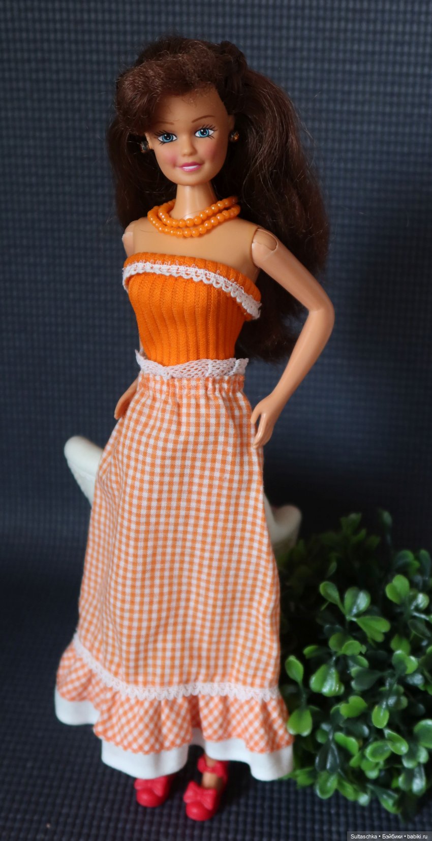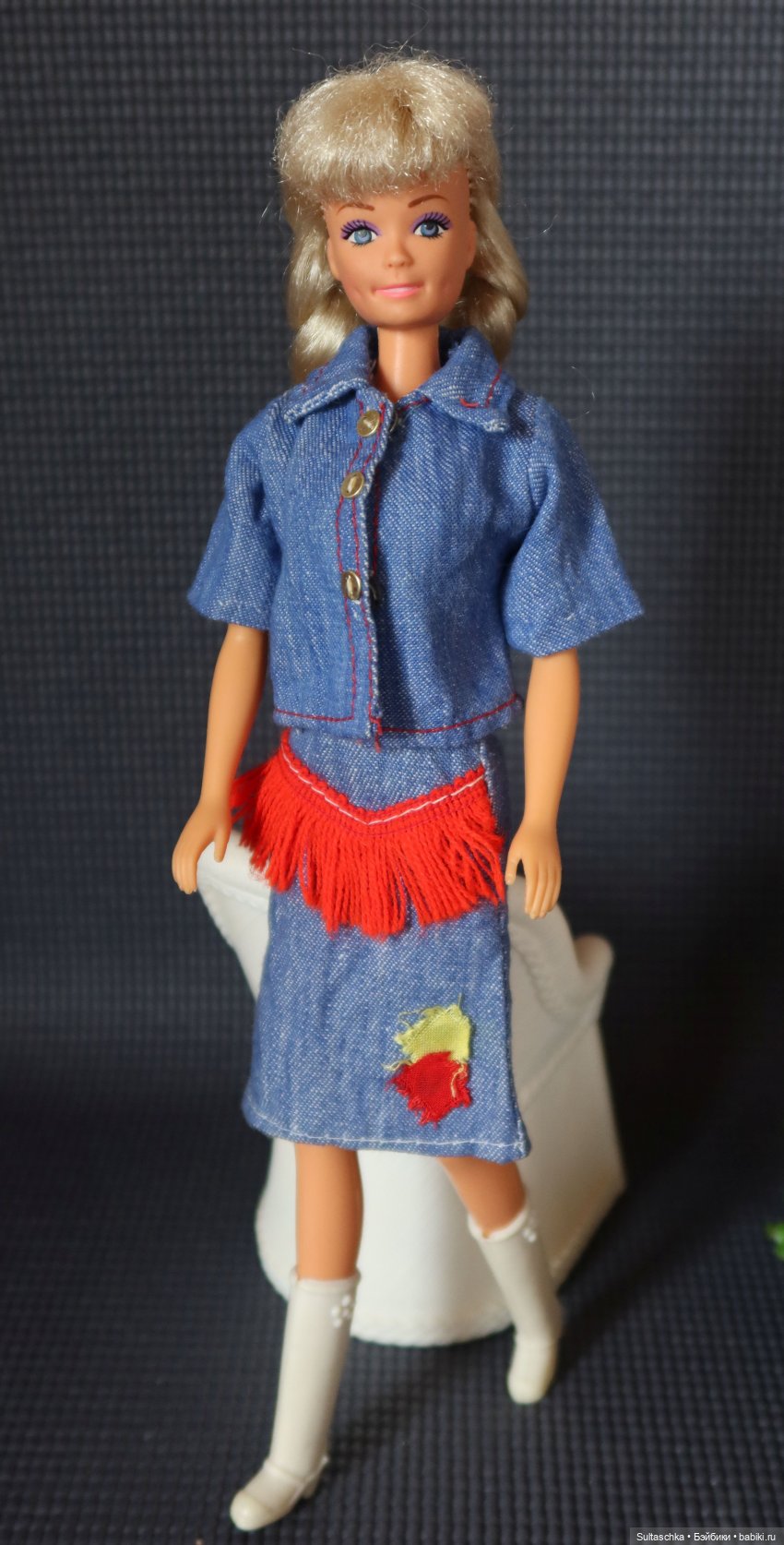 Но сначала немного о кукле. На мой взгляд у не очень своеобразный молд, лицо молодой женщины лет 35 — 40 с характерными ямочками на щечках. Довольно большие глаза и узкие губы в улыбке. Кукла из 90х, по этому с ней ассоциируется мода тех лет. Волосы не хорошего качества, я очень активно играла с ней в детстве, по этому волосы очень быстро превратились в «мочалку». Тело приятного цвета, с фигурой похожей на Барби, с поворотной талией, руки прямые или согнутые (не особо детализированные), ноги сгибаются на щелчки, на спине красивый логотип в виде кролика с надписью Lucky.