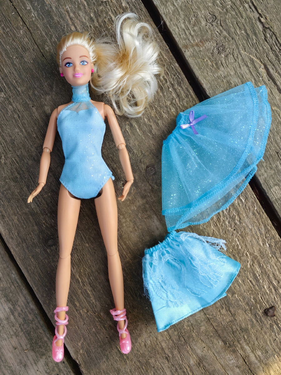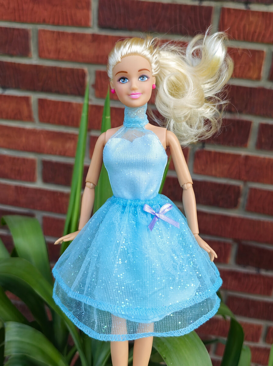 Наряд куклы состоит из красивого голубого боди и двух съемных юбочек. Сшито все очень аккуратно. В ушках куклы розовые сережки.