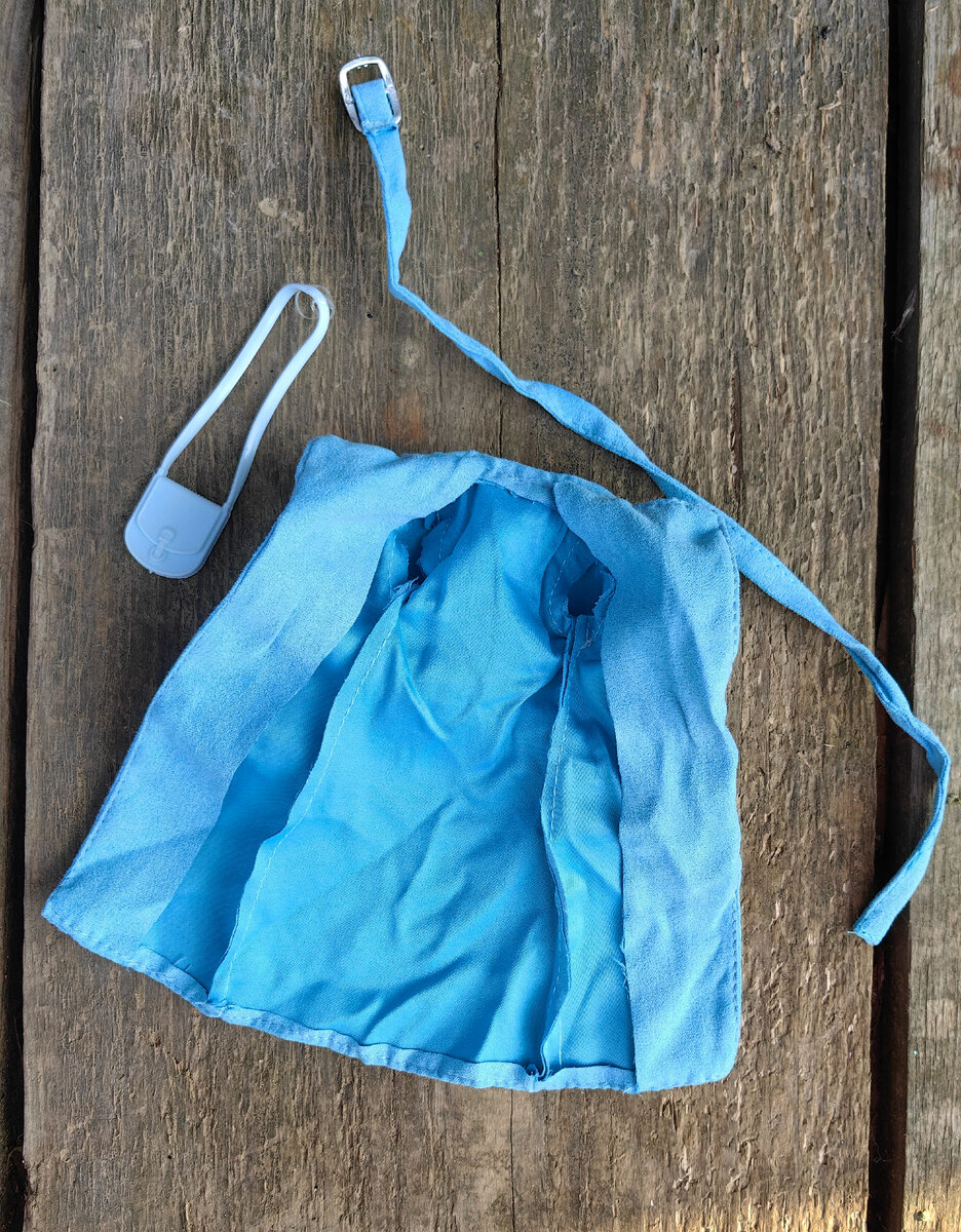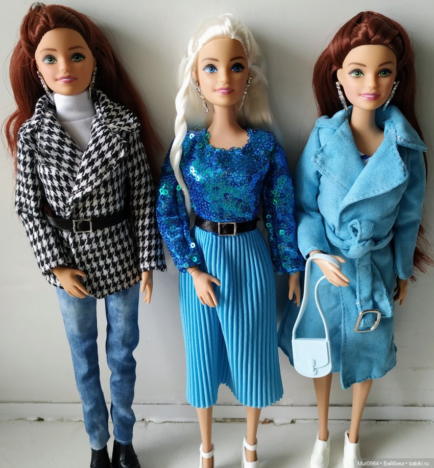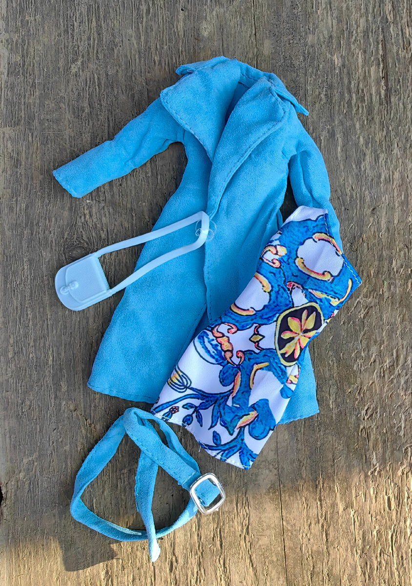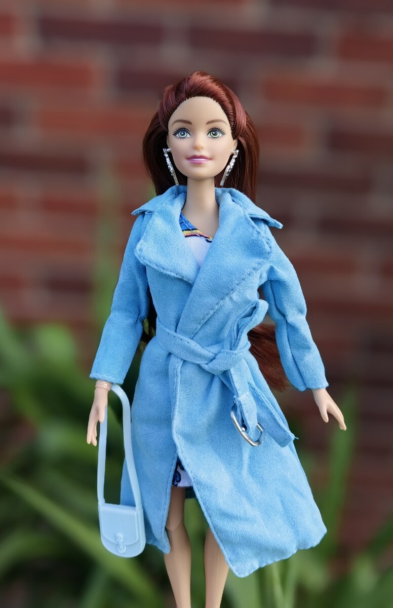 У куклы в ушах простенькие серьги, такие же бывают у Аврор из Фикс Прайса. Аутфит состоит из красивого голубого пальто, платье с лямкой через одно плечо, сумочки и красивых белых туфель. Очень мне нравится обувь у Софий!