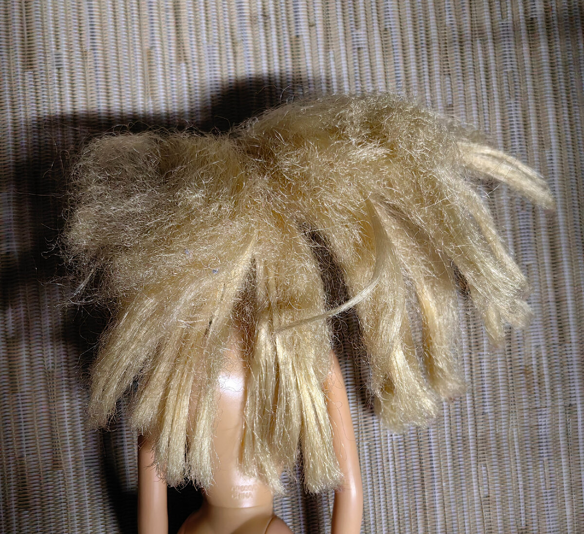 Волосы такие я никогда прежде не приводила в порядок, но теорию знаю. Так что куклу помыла, волосы намазала очень жирной маской для волос, даже не бальзамом. Вот с маской удалось прочесать достаточно быстро даже простой человеческой расческой и парой кукольных. Дальше голову промыла, сунула в кипяток и прочесала еще раз. Стало уже вот так.
