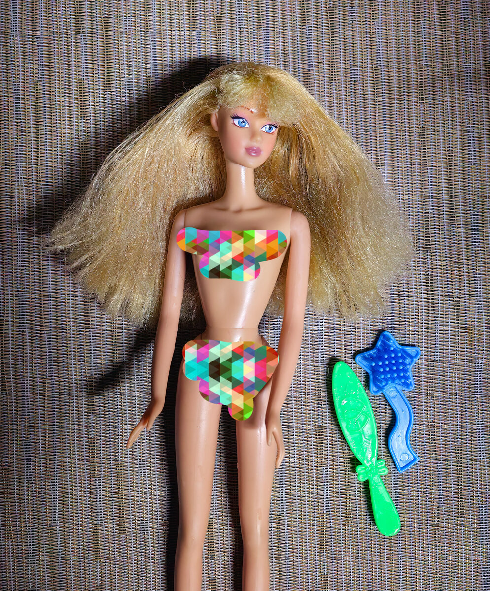 Лот стоил дешево, так что я решила купить — вдруг ноги подойдут. Но по закону подлости ноги, конечно же, не подошли моей Сьюзи. Так что если менять, то все тело. Это тело с маркировкой Симба. Ну а куклы вдогонку оказались Танями итальянского бренда Giochi Preziosi. Поразглядывала я этих Татьян — а ничегошные, интересные. Загорелая девочка с совсем печальным состоянием волос — там часть выдрана и часть срезана. А вот светлокожая с вполне целой прошивкой. У обеих работают шарниры в коленях. Есть мелкие повреждения корпуса, но не критичные. Можно попробовать заняться восстановительными работами. И первой на очереди стала светлокожая девочка. Вот такой у нас исходник — ершик для унитаза с почти целым телом и полностью целым мейком. На щиколотке у нее разрыв резины. Но это можно заклеить.