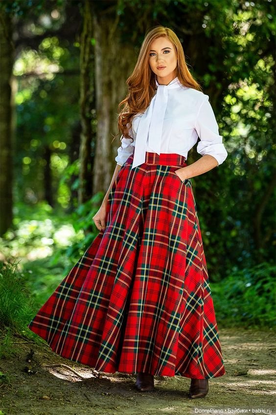 Собственно, это я всё к чему: меня привлекла вот эта девушка в тартане с высоким гладким хвостом и чёлкой. Причёска аккуратная и очень ей идёт, хвост с чёлкой и приятным лицом совсем не выглядит высокомерно. А на платье нет вычурных рюшевых отделок и бантов!