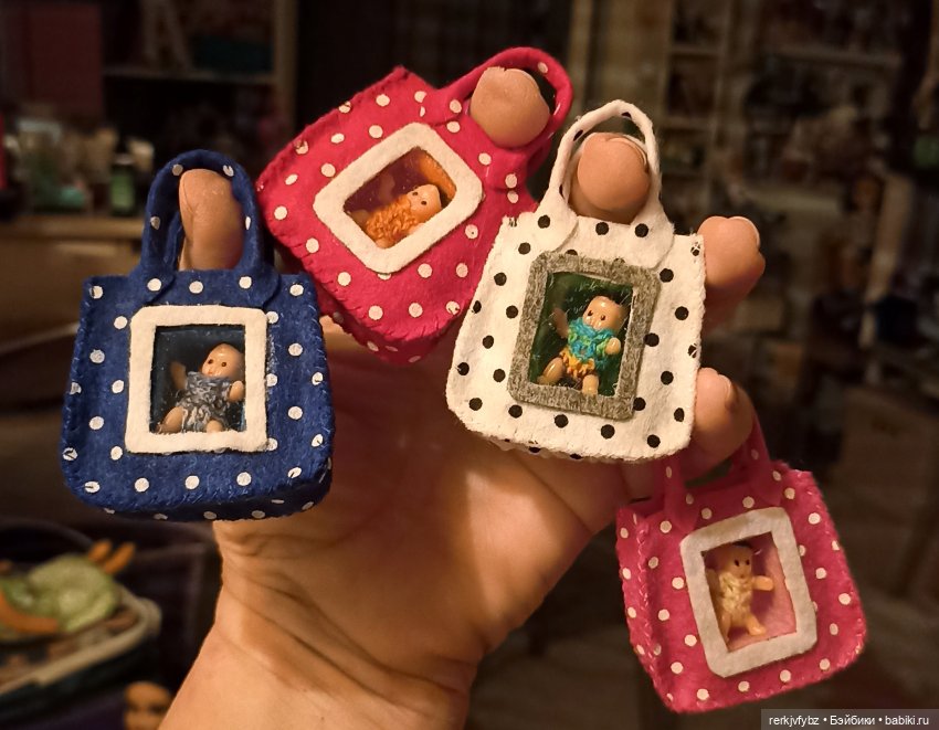 Купила мелких голышей… Сначала одела, а потом решила, что нужны сумочки, как у меня в детстве была ГДР с окошком и куклой.