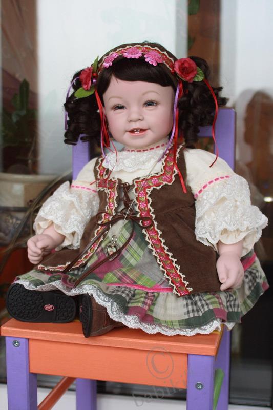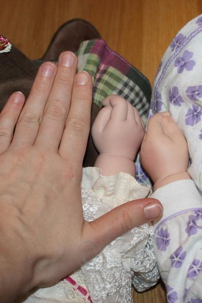 Такая малышка, крохотулечка. Личико — сплошное очарование, одежки — супер, еще ни у одной куклы не видела, чтоб так хорошо были пошиты, все на подкладке, даже свитерок, и кармашки на джинсах — не просто квадратик нашит, а именно карман, можно положить крохотный платочек