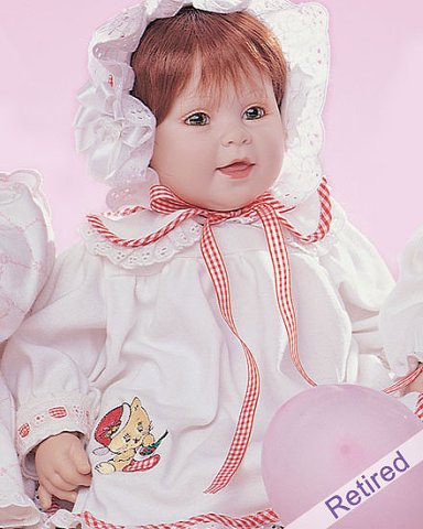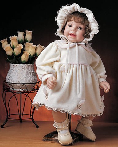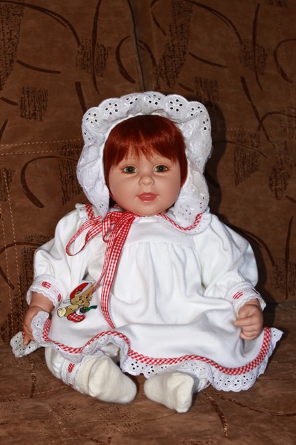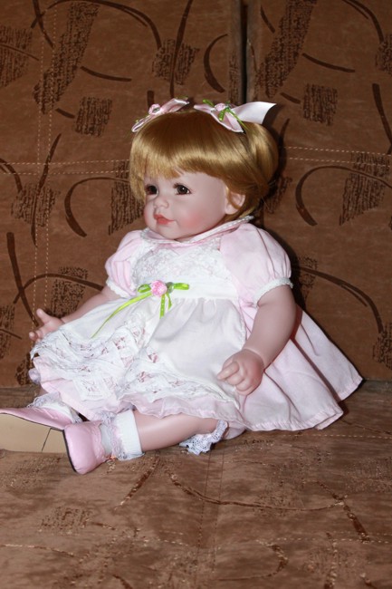 Следующей в нашей семье стала малышка из каталога 2011 года, дочка назвала её Леночкой, эта девочка самая её любимая, у неё светлые волосики, карие глазки и очень нежный розовый наряд с передничком вышитым ришелье.