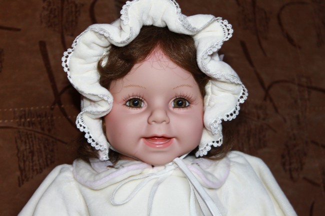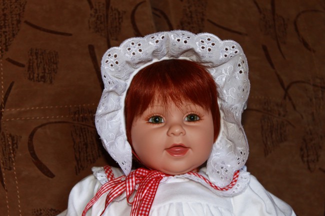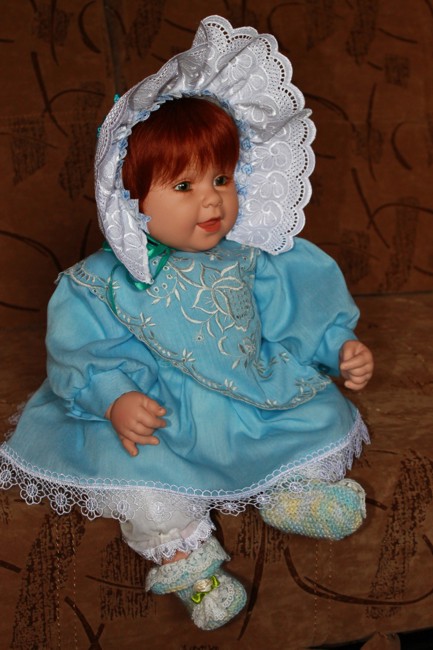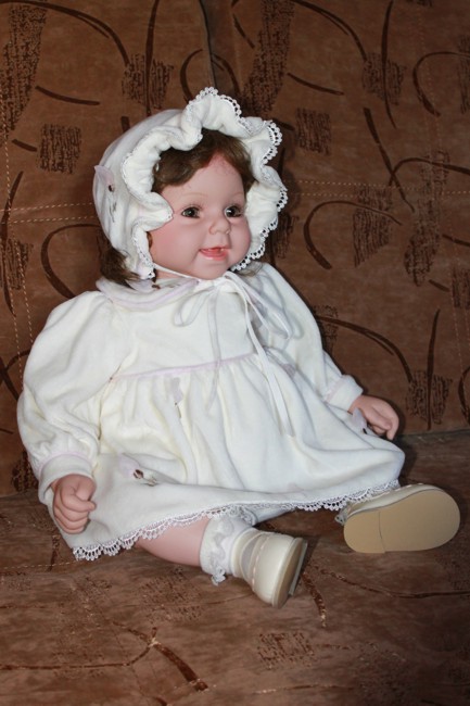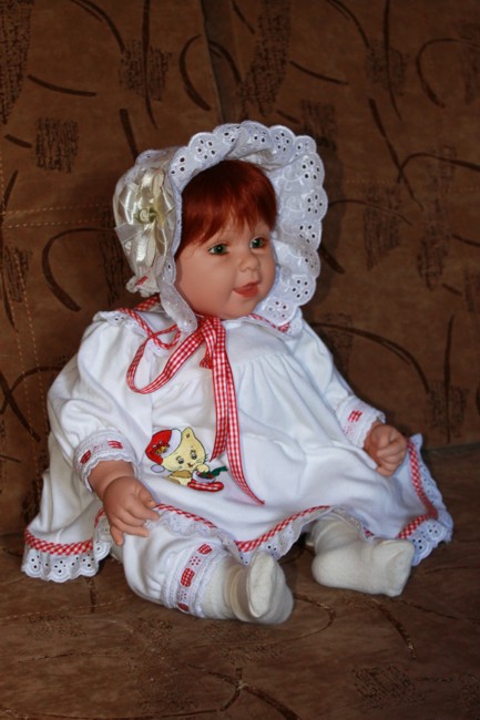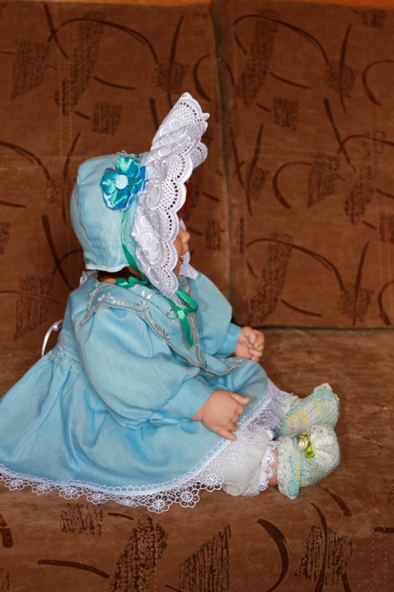 Малышка с красивыми зелёными глазками, густыми ресничками и каштановыми волосиками, в очень красивом наряде, чепчик украшен цветочками, мы решили этот наряд убрать и одевать по праздникам.