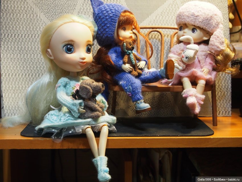 У меня так кухонный диванчик маленький бывает моим вязанием атакован. А куклы они повсюду))) куда ни глянь)))