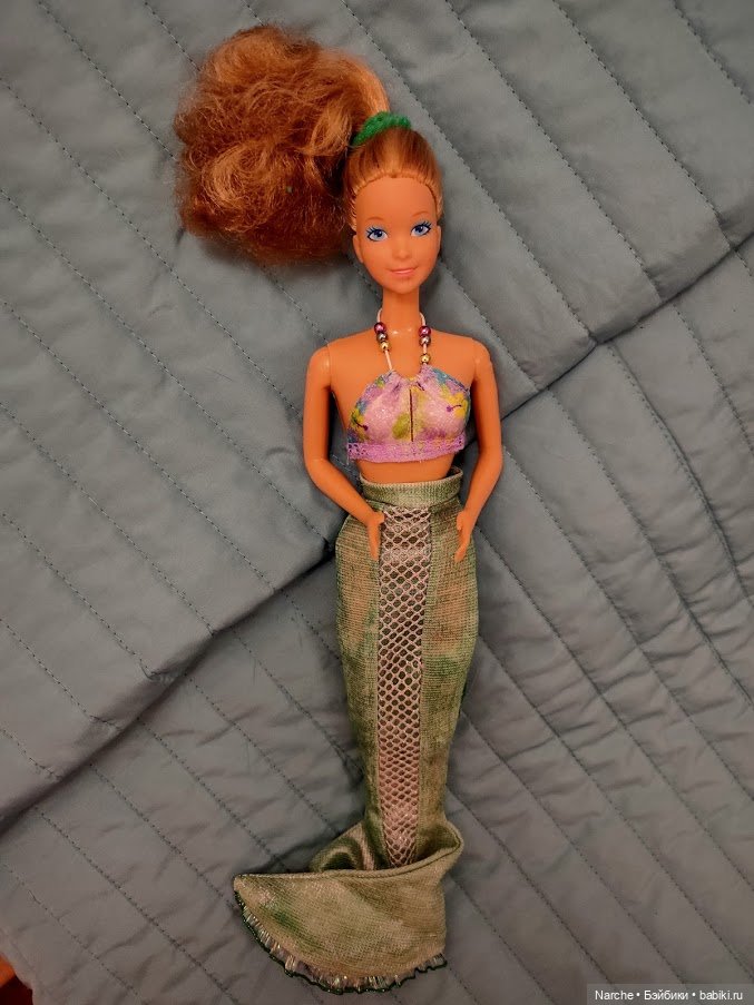 Вот такая Джаззи- русалка. Про русалок я ничего не нашла, может, это не ее аутфит? Волосы у нее не рыжие, а русые, освещение такое. Но не блондинка!
