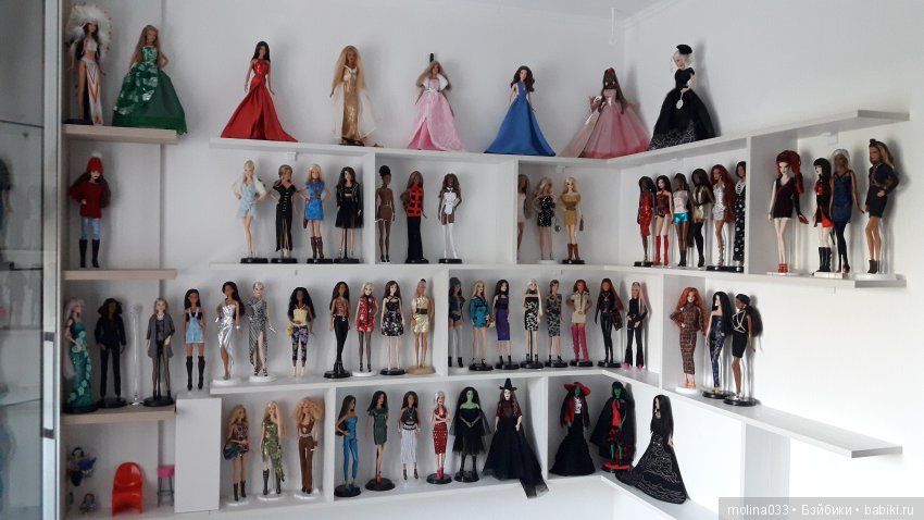 Вот мои две полочки, если только показывать Барби. Половина дочкины и не часто так ровненько сидят) у меня бзик, надо всех усадить, кажется им тяжело стоять все время)) ну и не все влазят на диваны, внизу те, кто играет обычно остаётся))