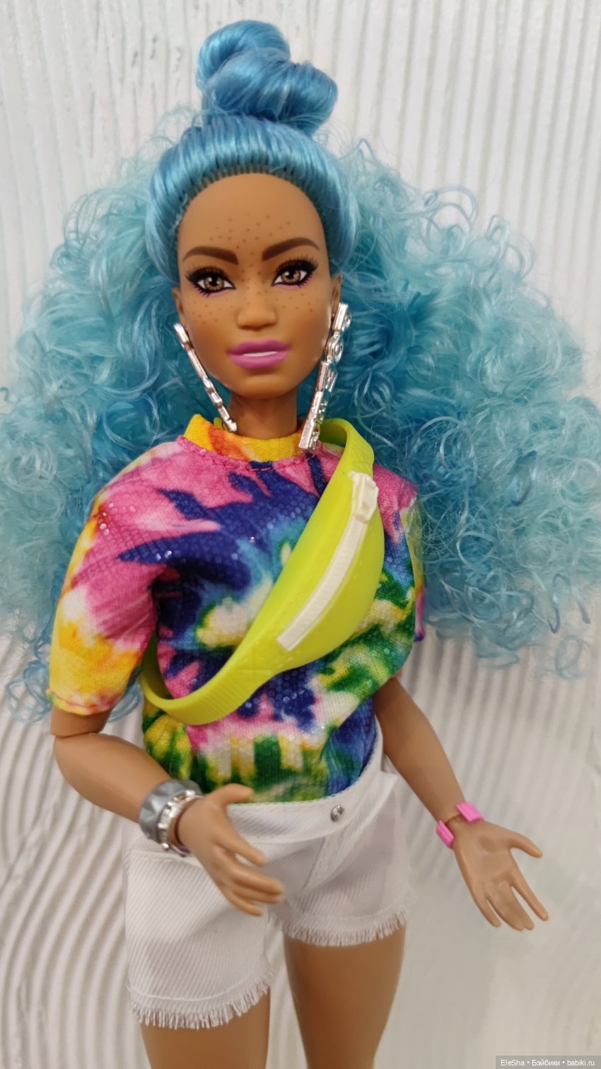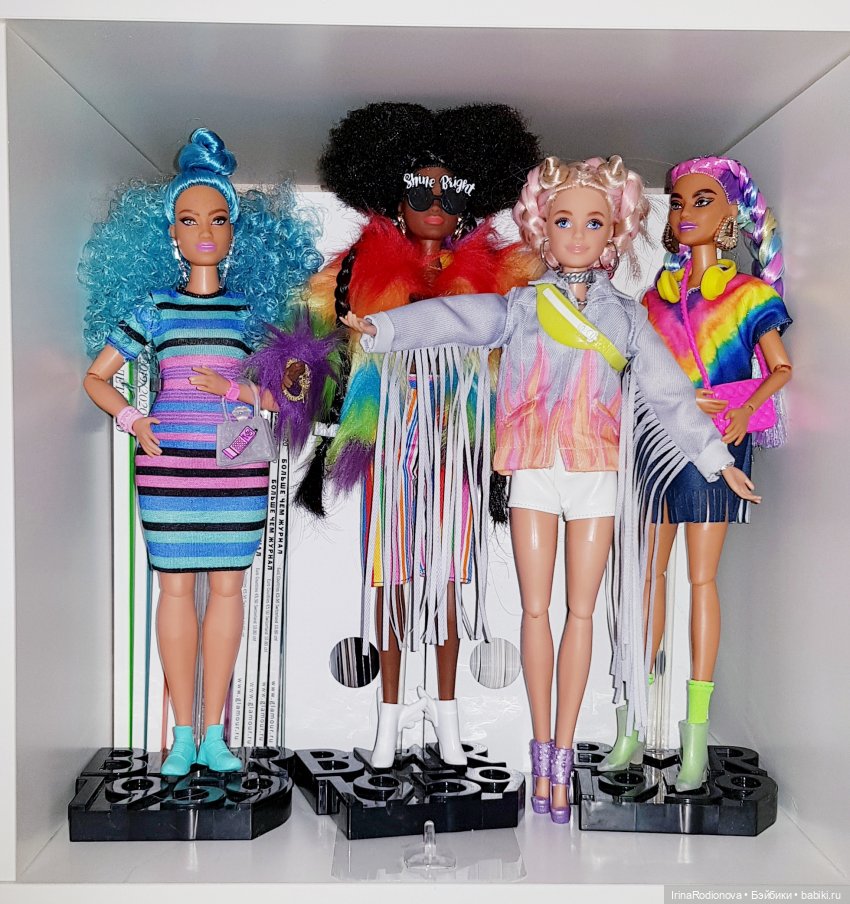 Линейка Barbie Extra Doll меня привлекла сразу своими яркими, необычными образами. Я всё кружила вокруг Милли в розовой шубке, но взять так и не решилась. А тут забежала на минутку глянуть, не появилось ли чего новенького и увидела всю коллекцию в ряд. У-и-и-и!!! Прям зависла от всей этой милоты и пестроты. Сначала купила трёх девочек, потом подумала-подумала, да и вернулась за четвёртой. На пятой — № 4, Кассандре, темнокожей пышке с голубыми волосами — уже и совесть проснулась, и деньги кончились, да и сама девочка для меня очень спорная.
