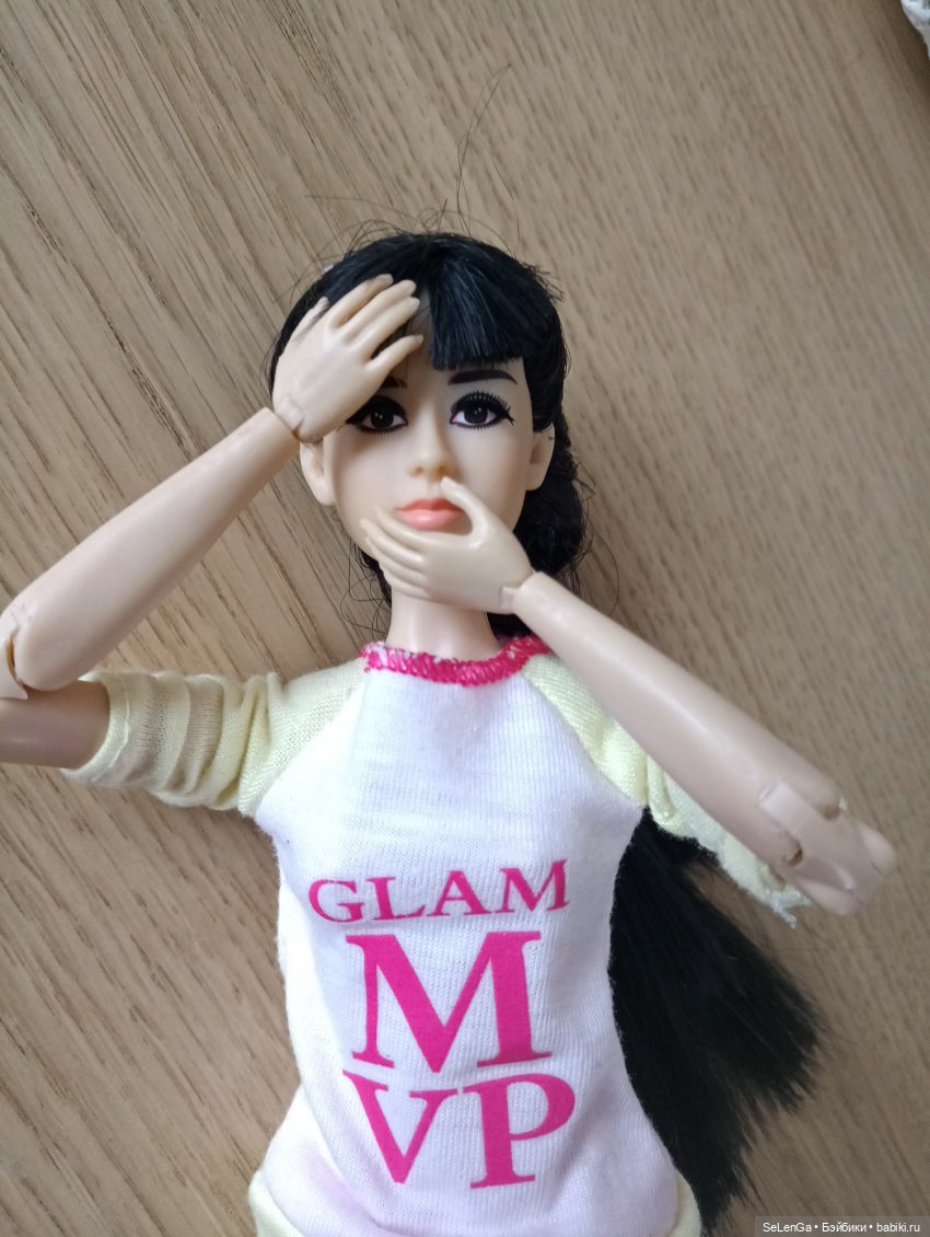 Теперь о теле. Поверьте, оно великолепно! Пластик приятный, шарниры имеются: сгибательные в коленях, в локтях, в кистях, в стопах. Также поворотные шарниры в талии, шарниры в предплечьях, тазу и в коленках для разворота ноги. Единственное ограничение — максимальный угол наклона туловища по отношению к ногам 90 градусов. Ну то есть пальцами рук до пальцев ног эта куколка не достает, все остальное — подвижно. Именно поэтому я намерена когда нибудь воплотить с ней танец Апсары) Апсара в индуистской мифологии — полубогиня их духа облаков и воды)
