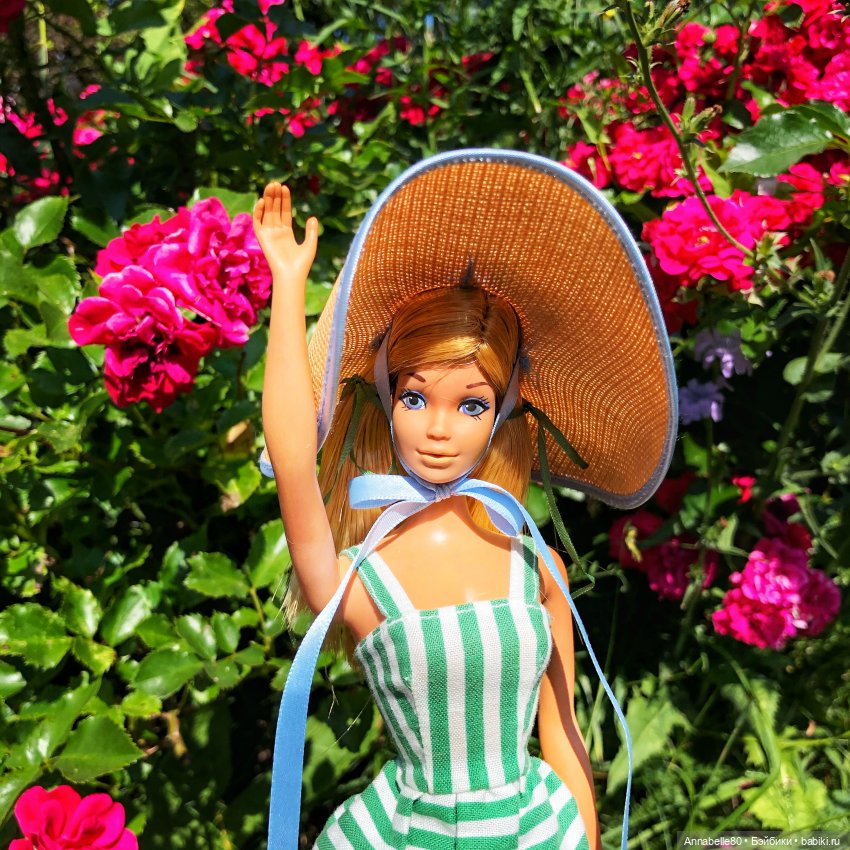 Вместе со своей старшей сестрой в 1971 году была выпущена и Скиппер. У нее светлые волосы длинной до талии, с прошитым пробором по центру и челкой. Глаза у куколки голубые, брови – коричневые, а губы – персиковые. Скиппер была одета в нейлоновый ретро бикини оранжевого цвета. Вместе с куклой в комплекте шло голубое пляжное полотенце. Скиппер попала в мою коллекцию внезапно. Я просто не смогла пройти против ее васильковых глаз, это была любовь с первого взгляда. Она в отличном состоянии, но покупала я ее нюд.