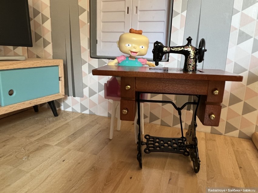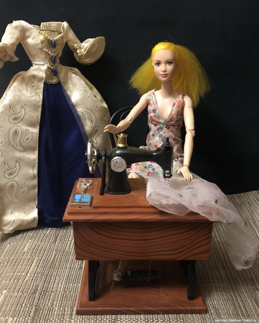 Маленькая предыстория: когда мне было года три, я крутилась вокруг мамы, которая что-то шили на нашей швейной машинке. Машинка была привезена бабушкой из Германии, разумеется, это был «Зингер». Машинка привлекала меня невероятно, пока я не сунула палец под лапку)) Нет, палец остался цел, и даже функционирует, но этот случай вселил в меня животный страх перед швейной машинкой. Ох и мучилась я в школе на уроках труда! Я могла построить выкройку, раскроить, сметать, но вот прострочить — это было сильнее меня:))) Поэтому я была уверена, что куклы мои тоже шить на машинке не умеют. Но, похоже, ошиблась. Потому что сначала мне попалась чудесная миниатюра швейной машинки. У неё крутится колесико, опускается-поднимается рычажок, ходит вверх-вниз малюсенькая иголочка, крутится шпулечка! И она очень красивая! Короче, я тогда не знала, зачем она мне, но схватила. А недавно в фотоконкурсе в ВК я выиграла столик «Зингер» от DreamStudio. И пазл сложился:) И тогда я задумалась, кто же, собственно, у меня шьёт? Ответ пришел мгновенно: Лёля, больше некому! Я вообще удивлена, что не догадалась сразу. Лёля уселась за машинку, и у нас отснялась, не побоюсь этого слова, короткометражка в стиле немого кино. Поэтому гасим лампы, тапёр садится за пианино, мотор!