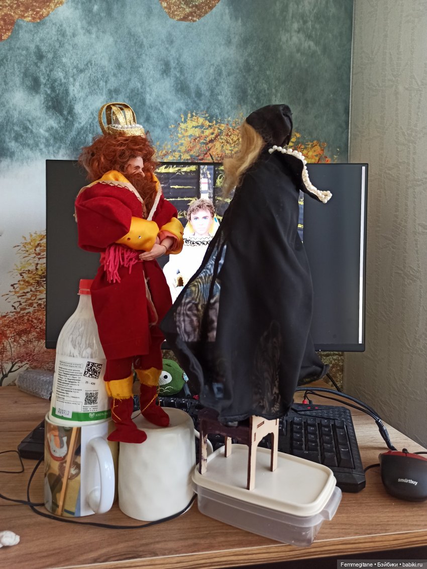 Добрый вечер! Как такового закулисья у меня нет, потому как, никак не возьму в привычку сохранять процесс съемки или процесс создания декораций. Мы с Оксаной Kaskoksana разделили роли Андрея и Варвары. Помимо пошива костюмов для героев(это было первое что я сделала😁), из декораций и реквизита я изготовила стенку терема из коробочного картона, который покрасила акрилом, решетка окна — из зубочисток. Трон на котором восседает рыбацкий сын — к готовому деревянному стулу вырезала из картона и покрасила высокую спинку и подлокотники. Корону склепала из золотой фольги от чего-то🤔, плотная такая фольга. Скипитр и державу вообще собрала на клей из того что нашлось в закромах — бусины, части от сережек, палочка от ватной палочки))).