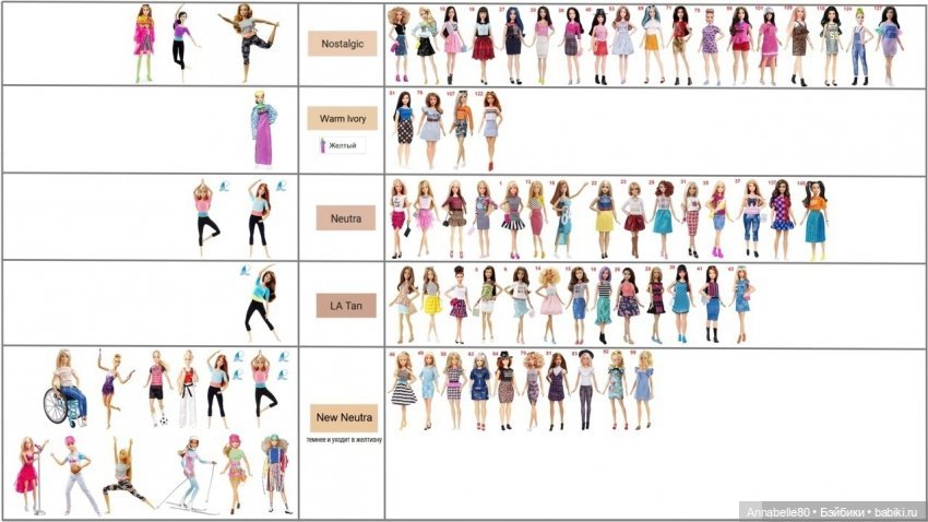 На обложке вот такое фото. Решила сверить скинтоны и при искусственном освещении, ведь чаще всего снимаю именно при нём. И столкнулась с тем, что буквально потерялась в скинтонах подвижных барби-тел. Что-то серее, что-то чуть желтее. Третью волну йог я вообще не покупала, сомневаюсь по оттенкам. Может соберём не формальные наименования скинтонов, а со всеми нюансами? Поможете?