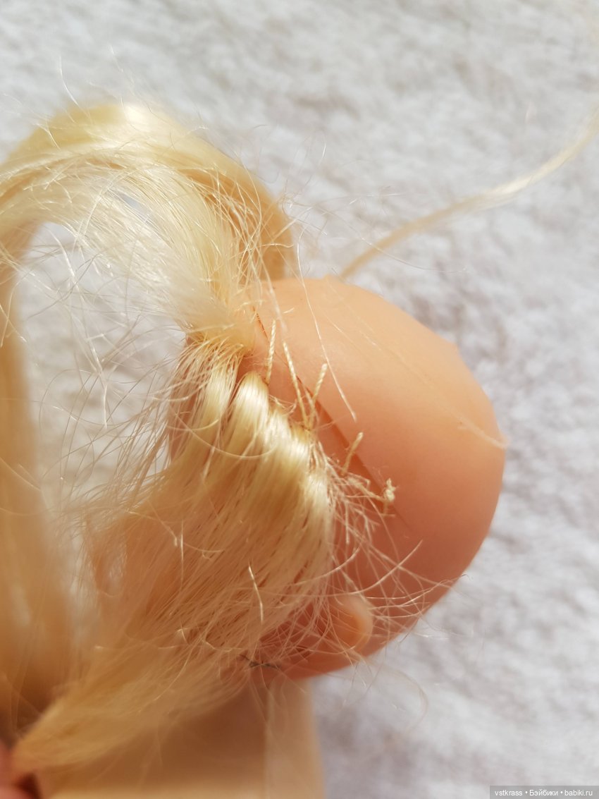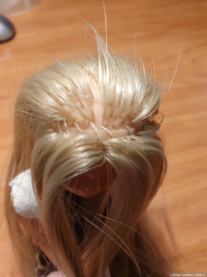 Я прошивала винтажек трессами с длиной волос от 15 до 25 см, не разбирая тресс, изнутри головы наружу, начиная с линии «роста волос» и заканчивая макушкой. Тресс должен быть хорошо прошит и не иметь коротких прядей. Тресс располагается внутри молда по спирали, более или менее плотно (зависит от густоты прошивки) прижат ко внутренней поверхности головы куклы. На головушку 1/6 хватает от 75 до 90 см тресса (зависит от густоты прошивки и размера головы). Получается длинная прическа «каскад», можно не подравнивать. После горячей укладки прическа держится и не деформируется. Плюсом считаю отсутствие необходимости закреплять что-либо клеем, бо опасаюсь химических реакций со старым винилом, а также то, что пространство внутри головы не забито волосами и узлами. Минусом считаю некоторые неудобства при оформлении пробора.