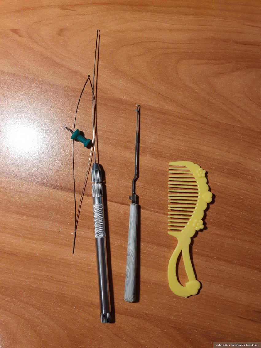 Прядь волос вставляется в иглу и протягивается снаружи внутрь через «пору» в голове куклы. Вытягивается, снимается игла и прядь завязывается на узелок. Вытягивается обратно снаружи, пока узелок не спрячется внутри головы.