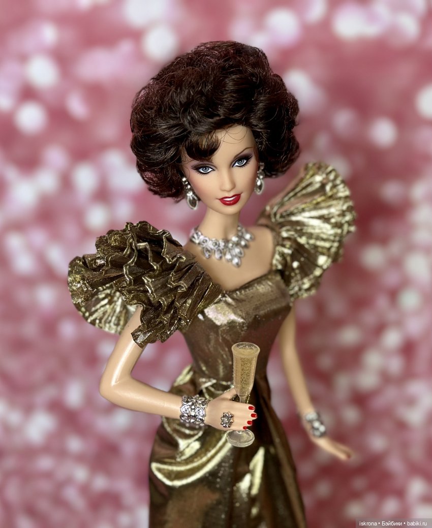 Платья из четвертого сезона были выбраны для юбилейных кукол неспроста. Это был пик популярности «Династии». Золотое платье Алексис появляется в 11 эпизоде 4 сезона, в котором все главные герои отправляются на благотворительный бал «Карусель надежды” – реальное мероприятие, устраиваемое каждые два года Барбарой Дэвис, основательницей Фонда детского диабета и Центра детского диабета в Денвере, на которое собираются сливки общества. Эпизод примечателен тем, что в нем появляются реальные Барбара и Марвин Дэвисы, потом Кэррингтоны обмениваются любезностями с экс-президентом Джорджем Фордом и его супругой, а Алексис жмет руку экс-госсекретарю Генри Киссинджеру. Ничего так камео для мыльной оперы!