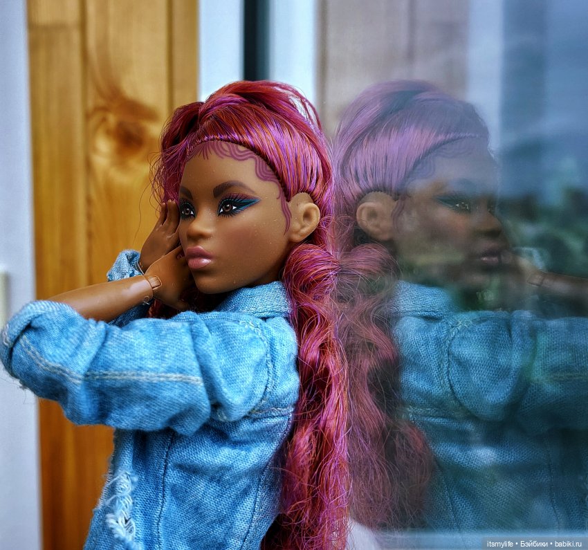 #14 Элль _Темнокожая кукла. У куклы красивые черные кудри, собранные в прическу, потрясающие голубые тени для век и ягодные губы. Приталенный укороченный топ с расклешенными брюками малинового цвета с высокой талией. Фиолетовые туфли на платформе выглядывают из-под штанин. Тип тела original.