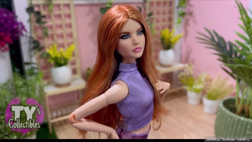 #13 Виктория _ Кукла с рыжими волосами. Красная юбка, желто-фиолетовый топ. Великолепные рыжие волосы с объемными локонами ниспадают на плечи. У нее потрясающие голубые тени для век и гранатовые губы. Мини-юбка из глянцевой кожи с драпированным корсажем, босоножки на танкетке.