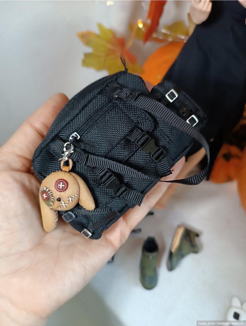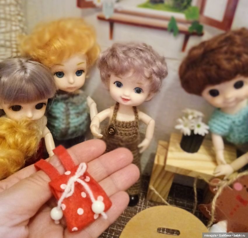 У моих кукол есть пара сумок, но они не универсальные. Я редко их куда-нибудь пристраиваю, пока лежат. Я шила и пару рюкзаков, но пока меня не устраивает их вид, поэтому тоже берут редко.