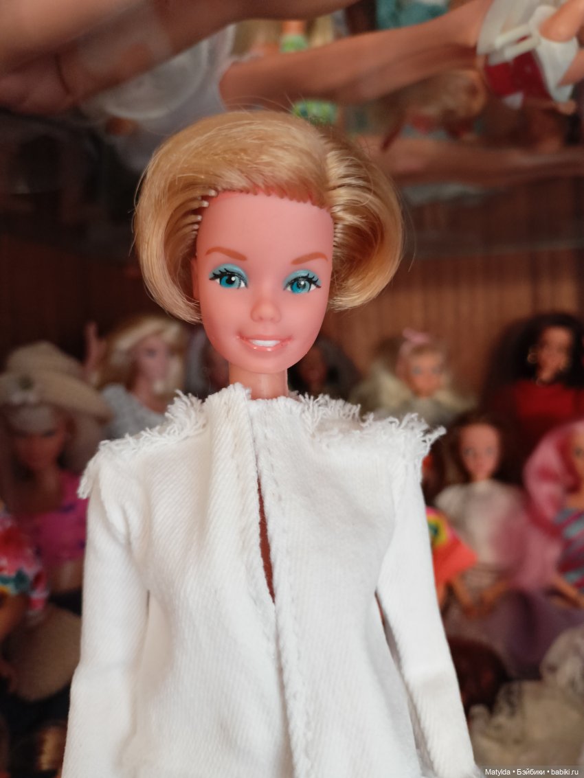 Привет! Уже давно я хотела приобрести в коллекцию оригинальную Барби на молде Суперстар 1976-1977 годов — вот ту самую тайванского производства с бирюзовыми тенями на глазах.НРФБ-варианты отмела сразу: ценник на них космический. Попадались несколько б/у вариантов, но либо у меня душа не лежала к девочкам, либо нюансы были для меня существенными. На время я отпустила эту идею и тут в шопике абсолютно неожиданно я увидела объявление Надежды Milania1116 о продаже Барби-невесты 1976 года выпуска. Конечно, оригинальный наряд не сохранился, да и волосы были сильно укорочены, но мне она безумно понравилась! Вот сразу поняла, что она — МОЯ. Не откладывая дело в долгий ящик, я оформила заказ, и вскоре получила мою Барбару. К ее приезду я прикупила розовые блестящие лодочки и оригинальное платье от Маттел из линейки Best Buy Fashions 1978 года — цвета фуксии, с розовыми воланами и без рукавов.