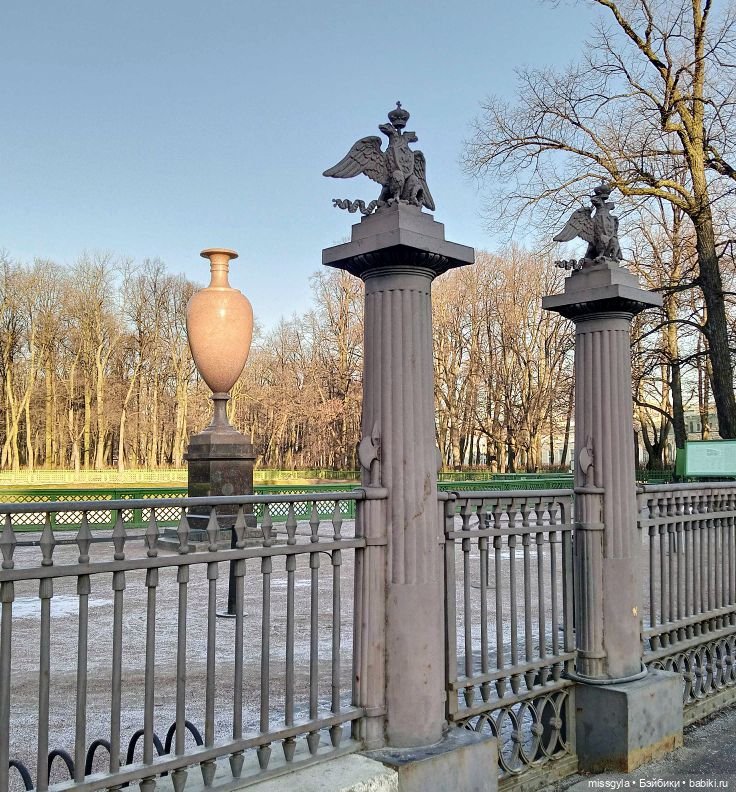 На территорию сада заходим с бокового входа (со стороны набережной реки Мойки). Здесь находится знаменитая Порфировая ваза — произведение камнерезного искусства (подарок императору Николаю I от шведского короля Карла XIV в знак доброй воли).