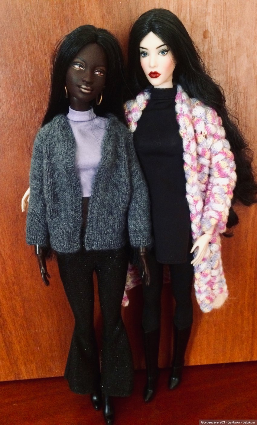 И вот вдруг я решила, что Симоне необходимо высокое тело, ведь самая первая черная Симона была на таком. Я выяснила, что ей подходит баскетболистка и очень быстро ее нашла. Были ещё морозы, кардиган связала тепленький.