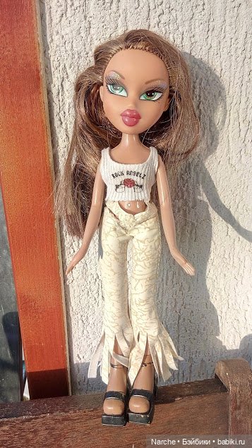 Одежда на ней была, интересные джинсовые штанишки и топик, но я не уверена, что это её родной аутфит, потому что на верхнем веке куклы блестки, предполагается, как мне кажется, что-то более нарядное. Я её немножко приодела, в меру своих способностей, и хочу вам представить. Ее зовут Ясмин. Надо будет ещё присмотреть ей подружку Хлою.