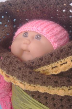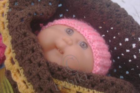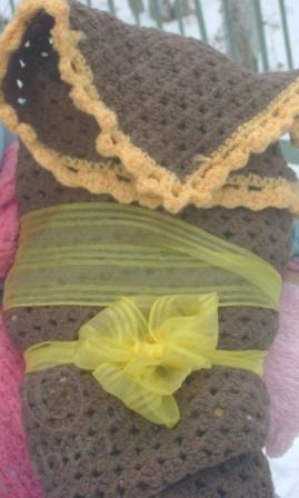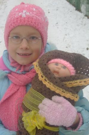 Мы на новый год были не дома, дочка сказала, что Олечку не даст нести в сумке, а так ей холодно будет по улиице идти… удачно я 31.12 сходила за продуктами — по дороге купила распродажной пряжи — тут же олечке сваяла теплый конвертик!