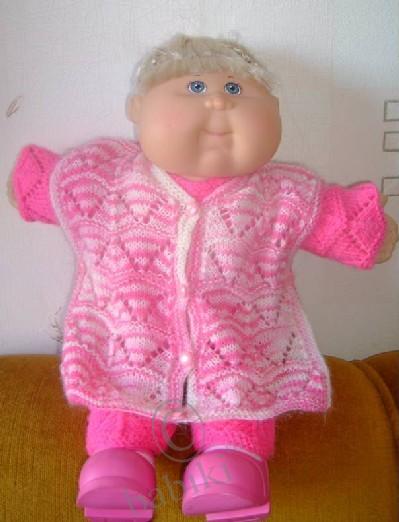 Пряжа — меланжевый мохер. Рисунок — тот же, что и на розовом костюмчике: изначально планировалось, что накидка станет частью комплекта. Потом решила, что подарим одной из капусток нашей крестной капустной феи… а пока Вивьен немножко помодничает