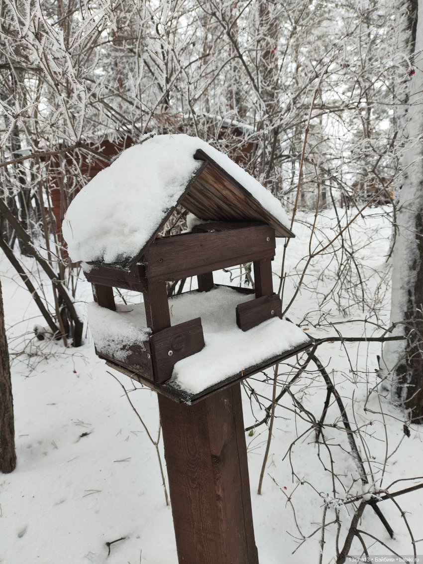 Наверное, самым необыкновенным, добротным домиком-кормушкой оказался вот этот. Он самый крупный и функциональный из многих, которых видели с Капусткой)
