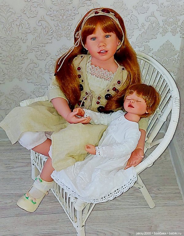 Анабель реалистичная большая кукла около 90 см. Выполнена галереей Эштона Дрейка (Ashton Drake). Хорошие густые волосы, изящные кисти рук, очень живое личико, аутфит из натуральных тканей. Оказалось, что она прекрасно смотрится в компании с моей любимицей Гвин, которой совсем не просто подобрать достойную пару.