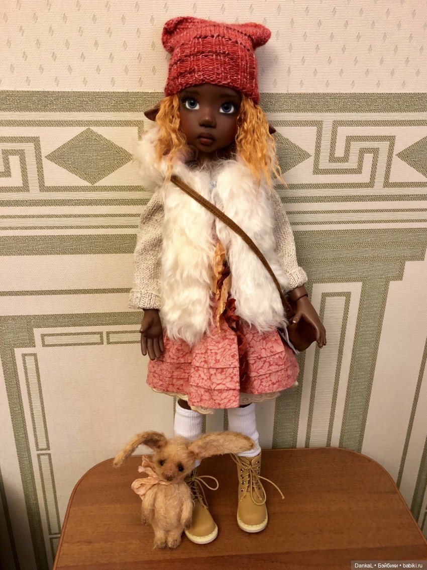 Недавно Кайе Виггс показала Лариссу в новом формате — слим мсд или миди (так этих кукол называет сама Кайе). Лара миди выпущена на уменьшенном теле Тоби. Очень самобытная получилась барышня! Я долго вздыхала над промо-фото (оно будет первым среди фотографий в топике)… а потом случилось чудо! Мне посчастливилось выиграть новогодний конкурс на англоязычном сайте, где главным призом была как раз Лара миди. Можно было выбрать солнечную девочку или барышню в темном тане. Питаю слабость к тёмным куклам! Особое счастье состоит в том, что расписала Лариссу сама Кайе. Ожидание было долгим, почти месяц провела кукла в пути. Приехала сегодня утром. У меня нет ни одежды ни обуви для этого формата, поэтому образ временный, сборная солянка.