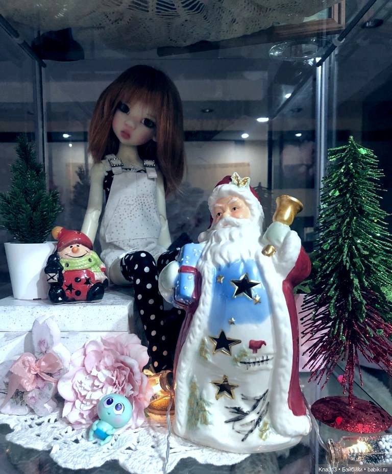 Моя Микуша в гости. Ее полочка в витрине уже новогодняя, а сами мы в домашнем наряде)))