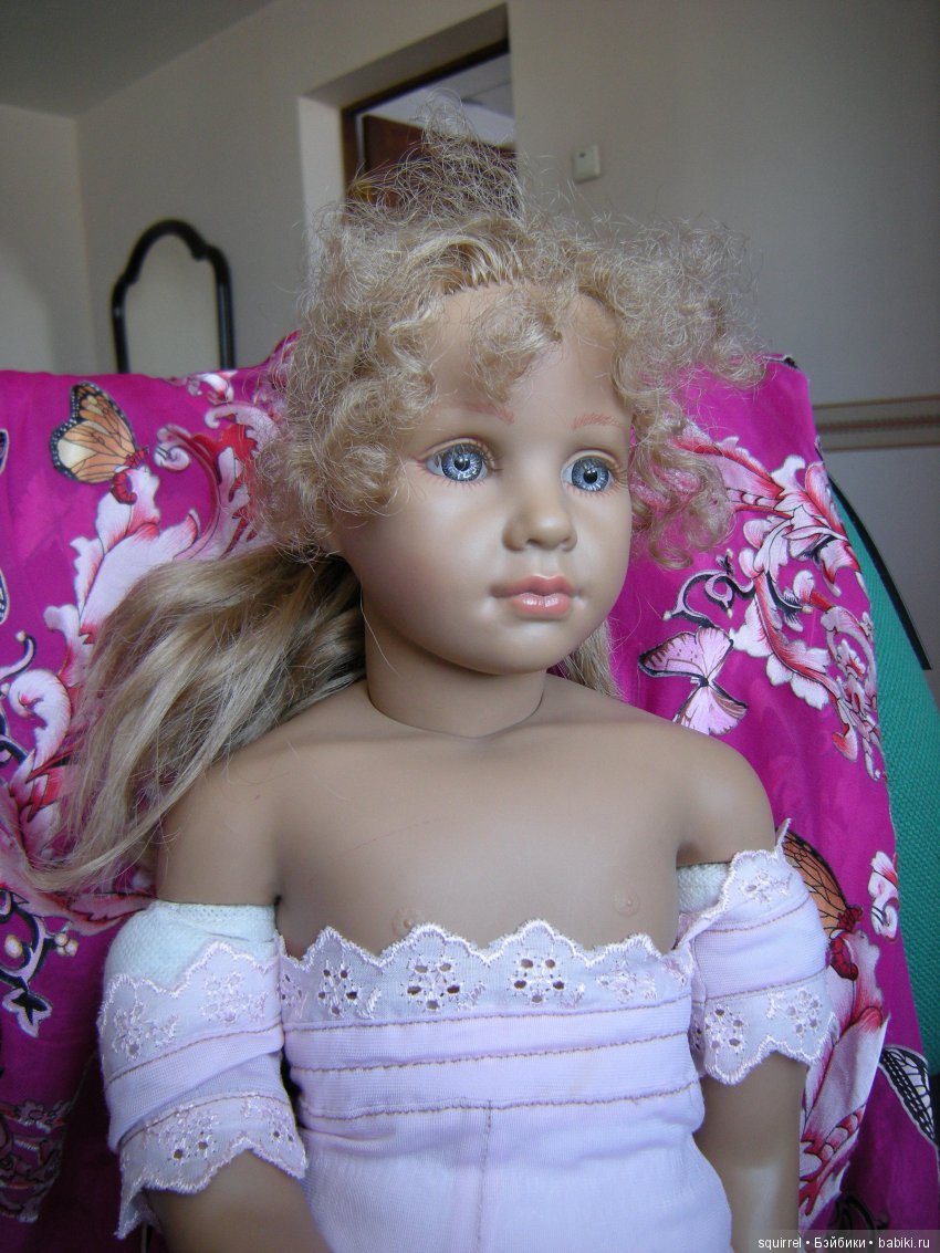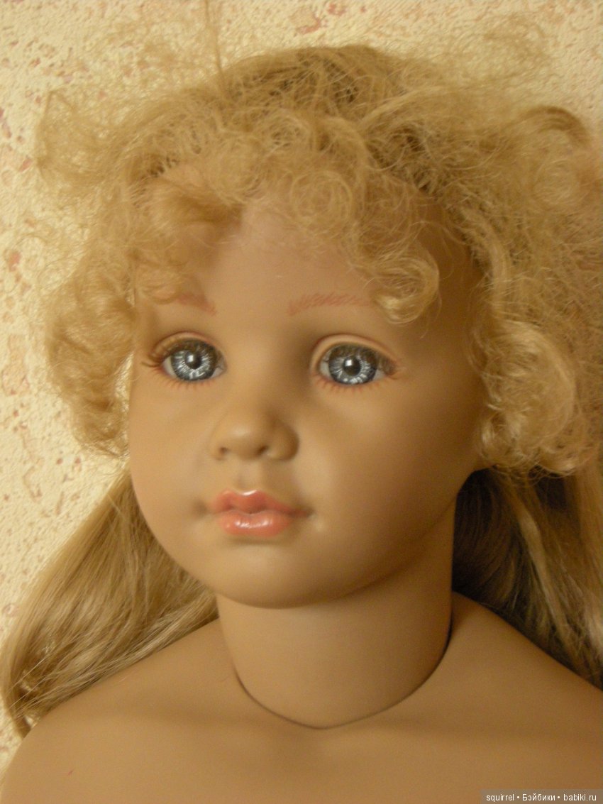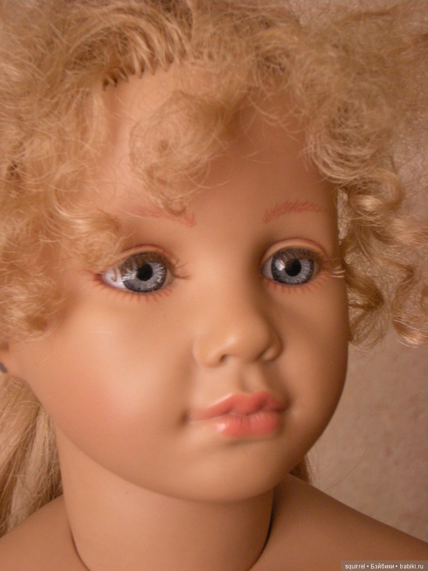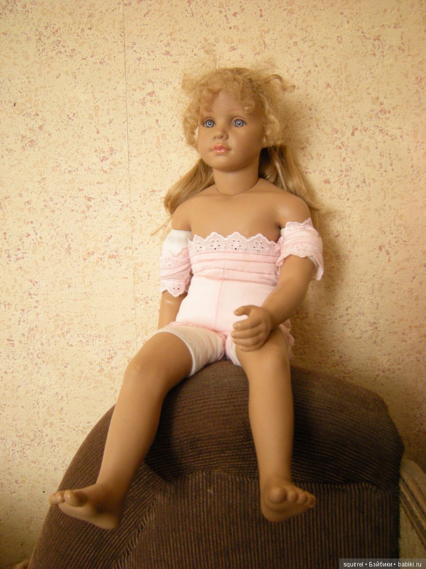 Девочки, уважаемые! Мне так понравилось, как Вы кукол опознаете… Вот у меня есть девочка… Покупала дочери, году так в 1999-примерно, в Москве, в «Кораблике». Куколка 60 см, материал-даже не знаю что-винил или биггидур, цвет у него всегда был такой сероватый. Может потемнел со временем немного. Были две разновидности-та, которую я купила-босая, в белом простом платье, которое на ней. И другая-гораздо дороже-в бархатном платье и ботиночках.Волосы очень качественные-много мыли и расчесывали-заплетали. Тело мягконабивное, в руках тоже есть вставки.Грудная пластина большая-под грудь, волосы на голове прошиты, глаза-стекло, по-моему… Может кто знает, что за дама, буду рада услышать.Рядом с ней-шкет-явно китайской выделки, но на нем никаких знаков нет.Кукол этих