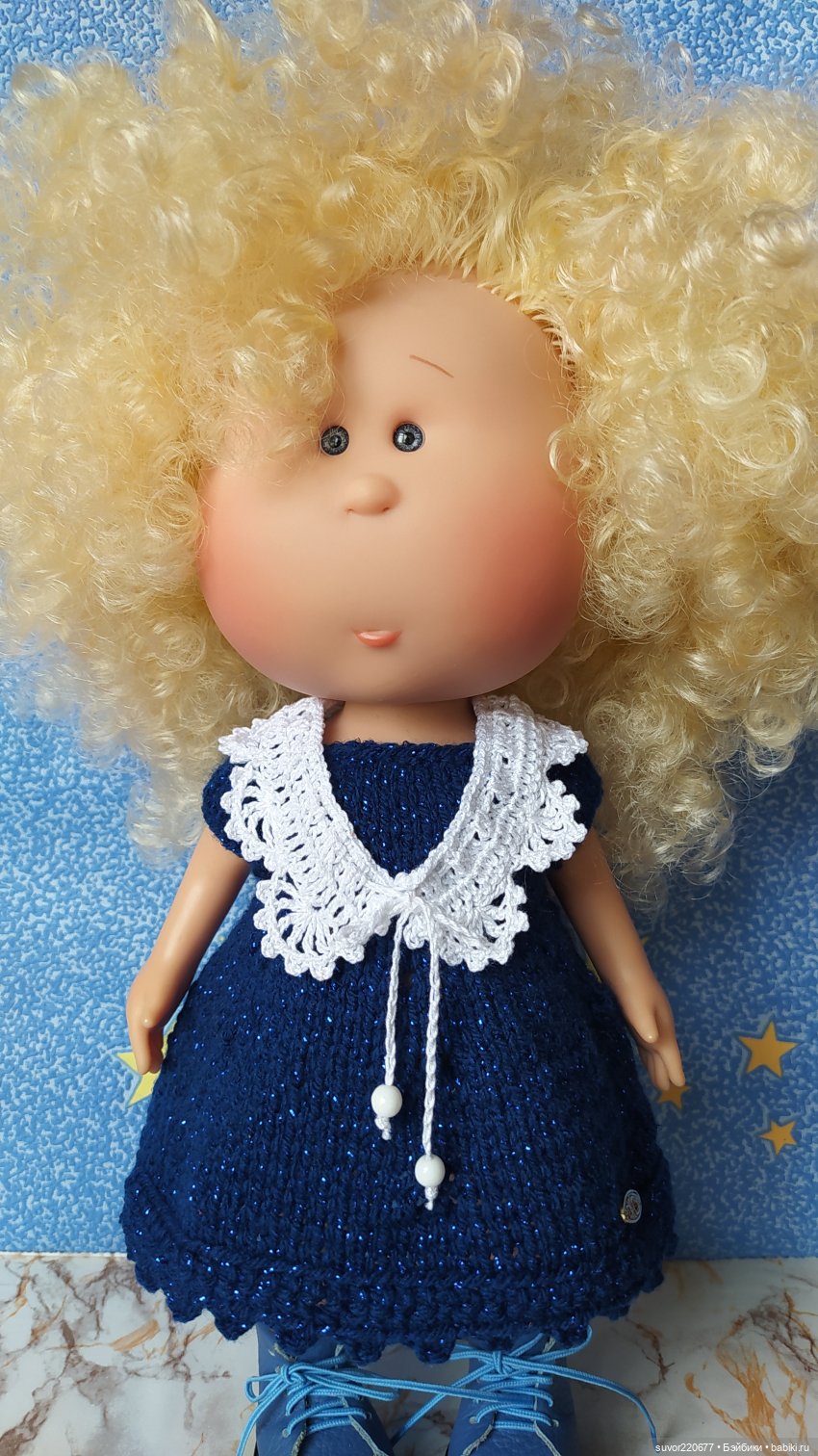 Добрый день, форумчане. Сегодня хочу показать вам красивое платье которое связалось специально для Миечек. Платье красивое: темно-синее, с легким блеском от люрексовой ниточки, белый съемный воротничок. Моей Машуне очень понравилось. Конечно не обошлось без хулиганства, ох уж этот характер… :0)