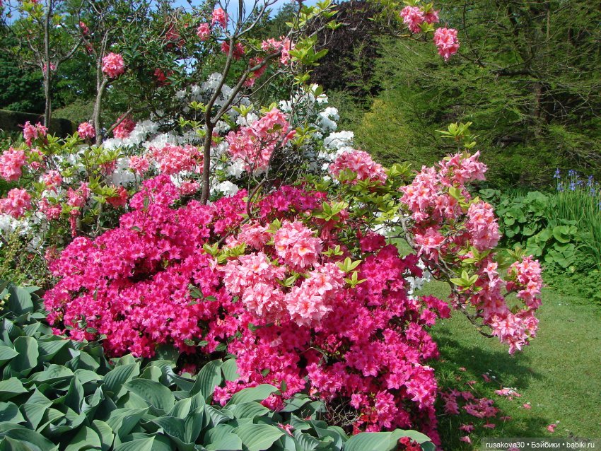 Там начали цвести рододендронды, азалии и другие кусты и цветы.