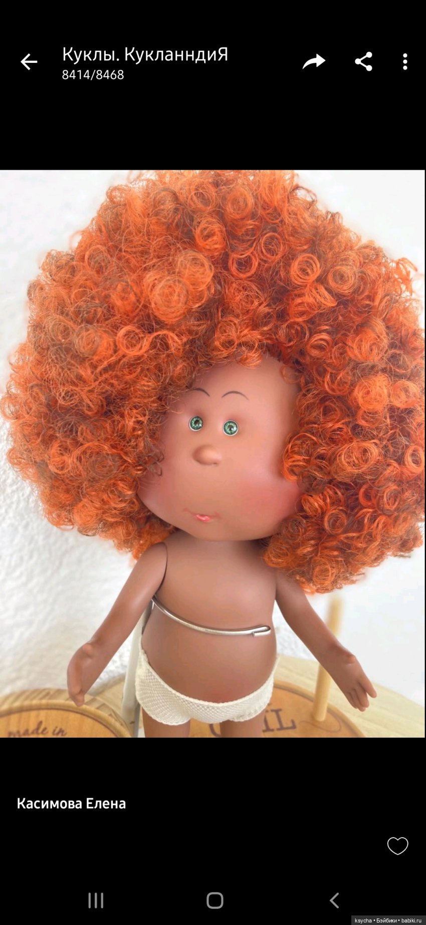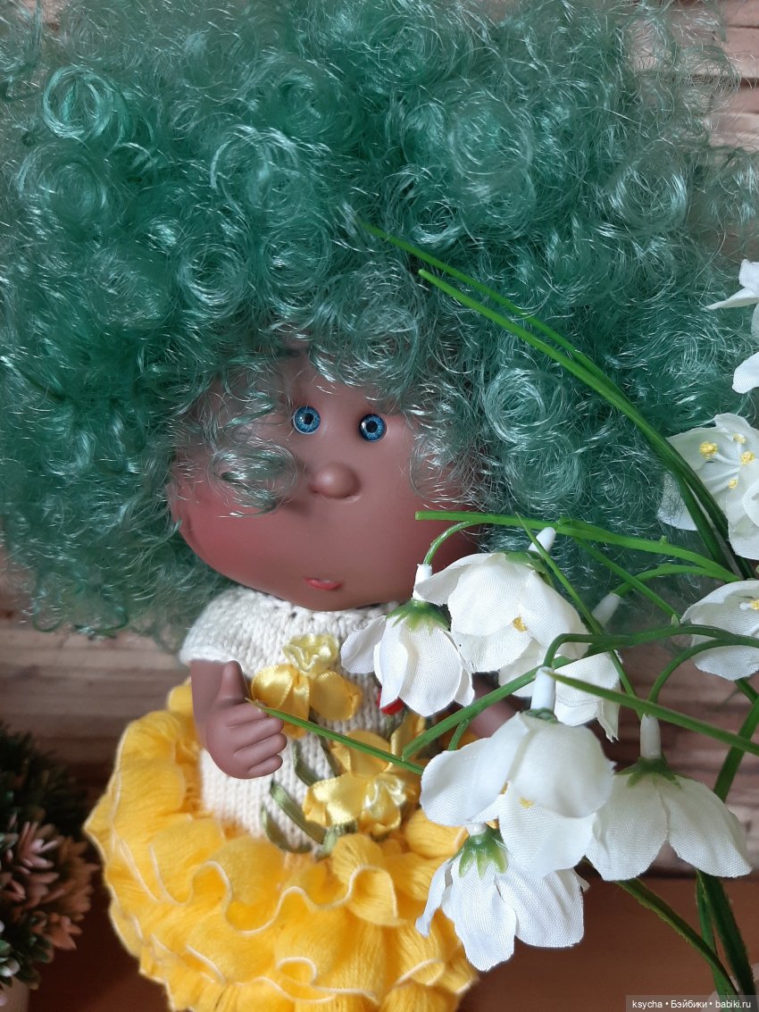 Сегодня получила, распаковала и… не ошиблась я с выбором! Моя! И цвет винила, вкусный и цвет волос, ах:) А в комплексе, очень яркая и шикарная девчуля получилась! Волос море, густые, не лезут, все барашатся, колечками. Не причесывала, как достала с пакета, взбила руками и вот:) винил не очень твердый, но и не совсем мягкий, как попадался раньше. Ноги одной длинны, стоит сама уверенно.