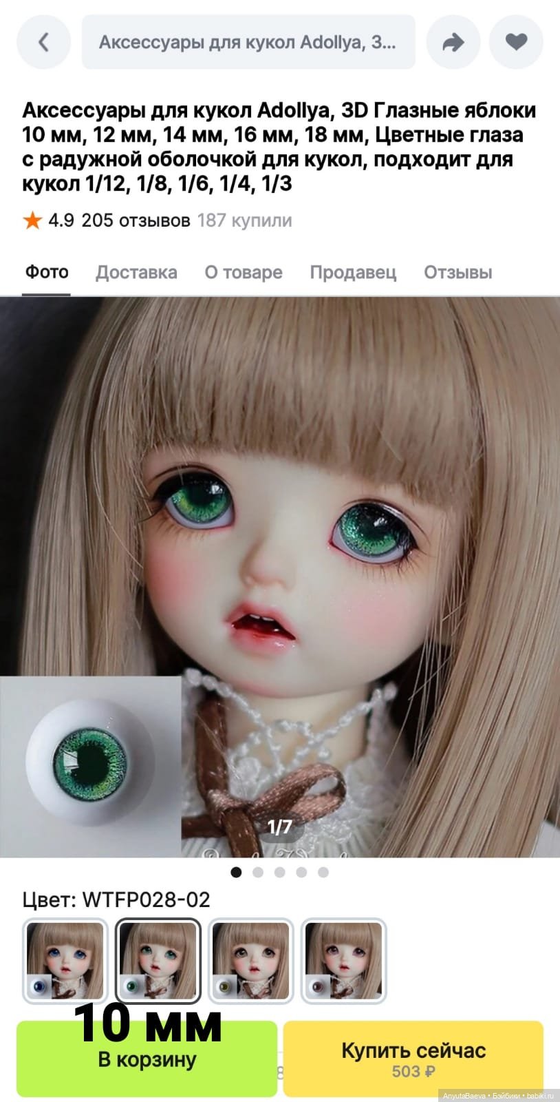 Я заказывала на Алиэкспресс, глазки 10 мм.