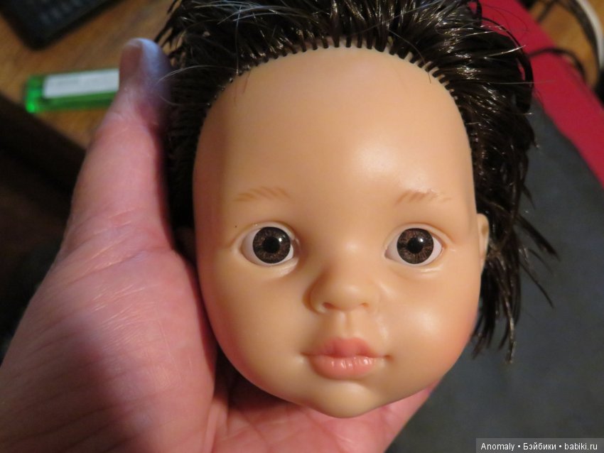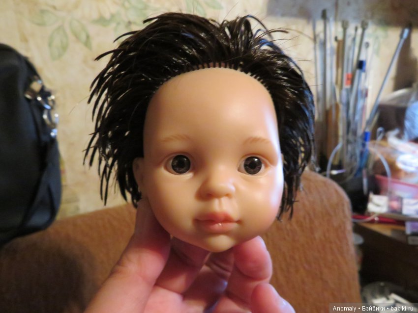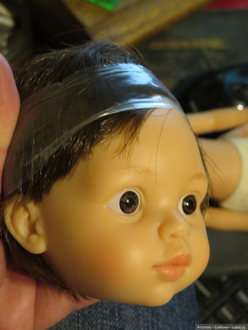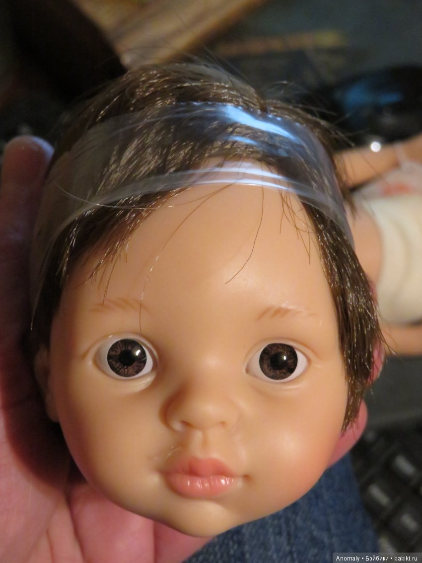 Поэтому утром сняла у новенькой Даши головку, разогрела кипятком изнутри винил, вынула глазки, и на точильном камне сточила их основание примерно на 2 мм.Потом вставила их обратно, вклеила реснички под цвет волос, установила головку на тело, и на меня взглянул спокойный, задумчивый ребёнок.