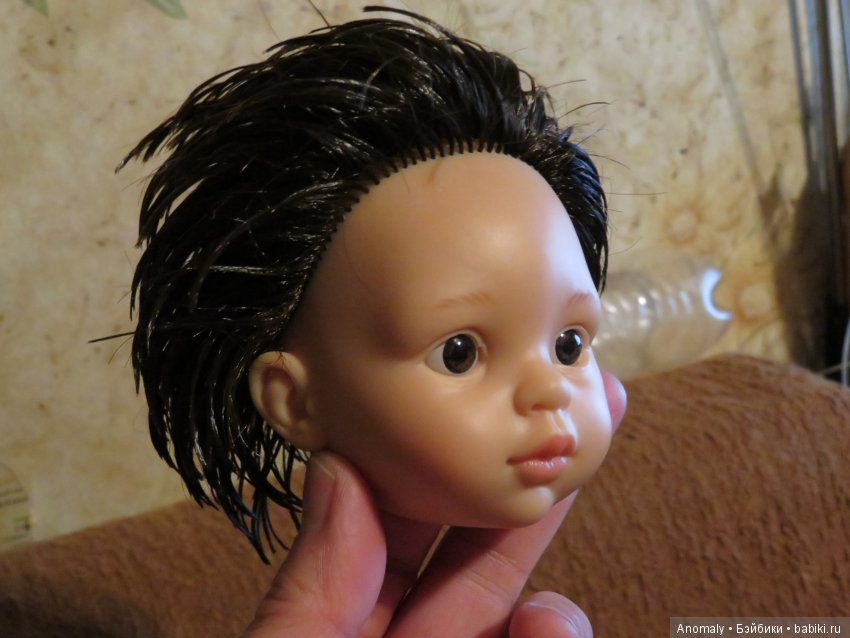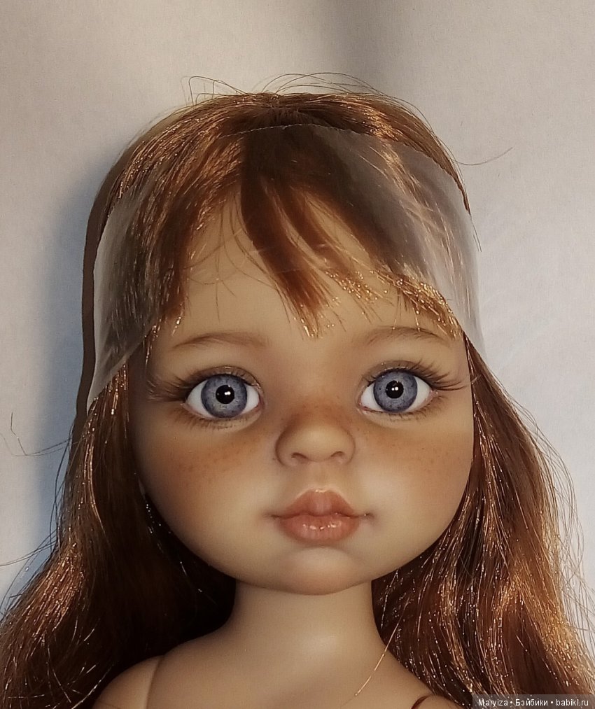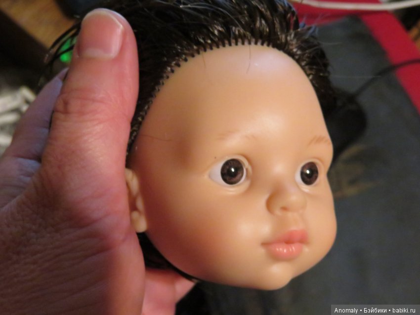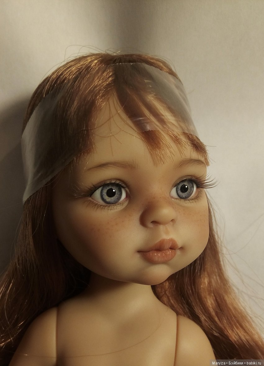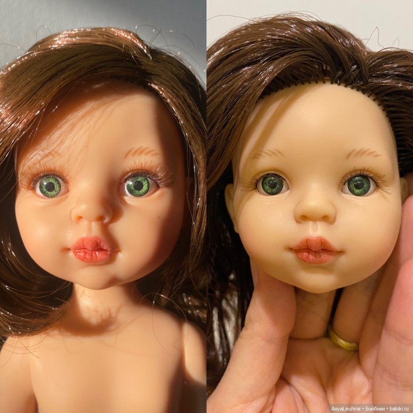 Поэтому утром сняла у новенькой Даши головку, разогрела кипятком изнутри винил, вынула глазки, и на точильном камне сточила их основание примерно на 2 мм.Потом вставила их обратно, вклеила реснички под цвет волос, установила головку на тело, и на меня взглянул спокойный, задумчивый ребёнок.