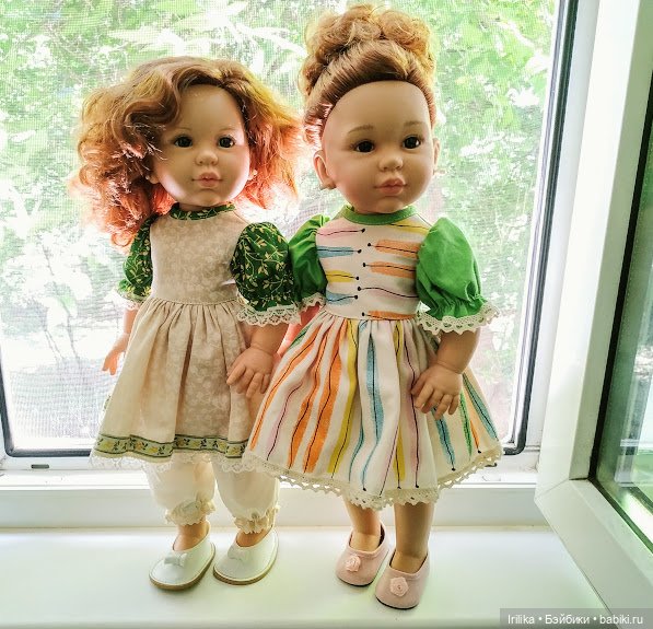 Девочку с тёмными волосами купила не в родном аутфите, но от них же, от Сой Ту. Штаны белые и полосатая блуза и панама.