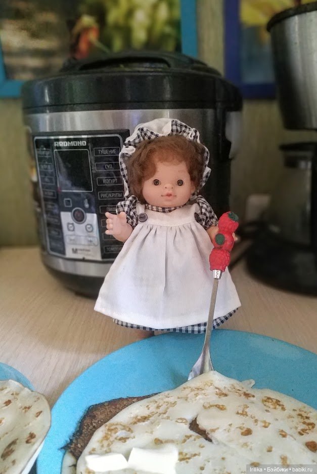 У Дуняши теперь есть настоящий поварской комплект- фартук и колпак, очень удобно при готовке, ничего не испачкаешь, опрятно смотриться. Дуся в эом наряде — такой симпатичный поварёнок! Только личико немножко сосредоточенное на фото вышло, девочка очень переживала, потому что — хоть и несложный рецепт у пончиков, но работа с любым тестом — очень ответственное дело!