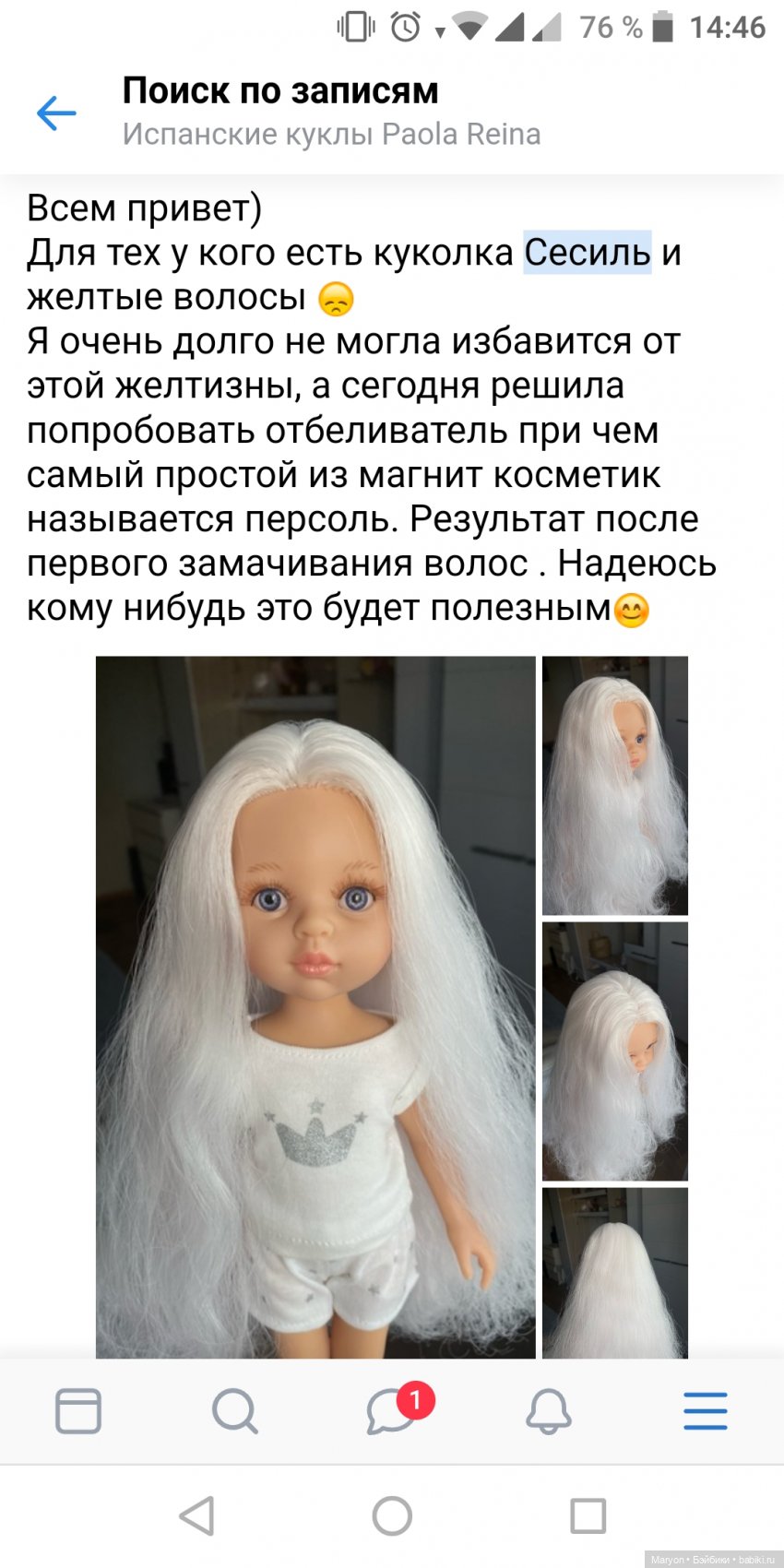 Здравстуйте, дорогие бейбековцы. Решила написать топик с проблемой и просьбой о помощи. 😭Полгода назад купила себе шарнирную паолку Сесиль с белоснежными волосами. Волосы сыграли немаловажную роль в выборе. При получении и ближайшем рассмотрении дома, волосы оказались не очень качеством, сильно путались, лезли просто ужас🥺(кстати первый случай с куклой данной фирмы), в результате запела их в косу, а куклу поместил в коробку. И вот недавно достаю куклу из коробки, а у нее волосы позеленели 😳. Зелень идёт по контуру головы и по косе, где прилегало к одежде. Пробовала мыть волосы просто, с применением шампуня для удаления желтизны. Но ничего не помогает😭. Может у кого была такая проблема подскажите, как решили. 🙏 На фотография, они кажутся жёлтыми, но в реале они бледно зелёные. Хотела Снегурочка, а получается Кикиморка🙈
