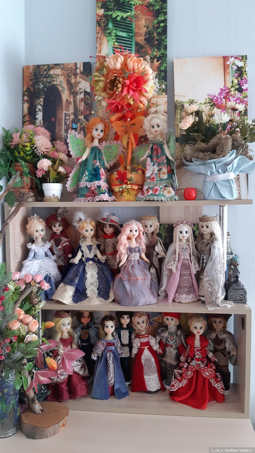 Я коллекционирую не самих кукол, а образы: сказочные герои, исторические и национальные костюмы. Куколки -девочки мне нравятся, но в основном любуюсь у других, у меня таких очень мало. Окончательные образы у меня только у половины кукол наверное. Например на полке с восточными принцессами, ни у одной из 4-х, нет костюма и образа. Так что работы, еще ни на один год. А новые идеи рождаются и плодятся, а кукол ставить реально некуда. Давно пора остановиться, но как заткнуть этот идейный фонтан.
