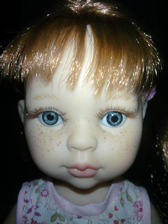 Заметила два дня назад, что у Дашеньки один глазик стал мутноват. Стала рассматривать и пытаться отмыть. Выяснилось, что это и есть тот неводостойкий клей, которым были приклеены реснички! Этой гадостью, оказывается, был и глаз испачкан! В процессе отмывания клея, отклеилась и ресничка. Я аналогичным образом отмочила вторую, отмыла их от клея. Кстати, я, когда пыталась укрепить реснички суперклеем, наносила его поверх простого клея, так что все отшло и отмылось без проблем.